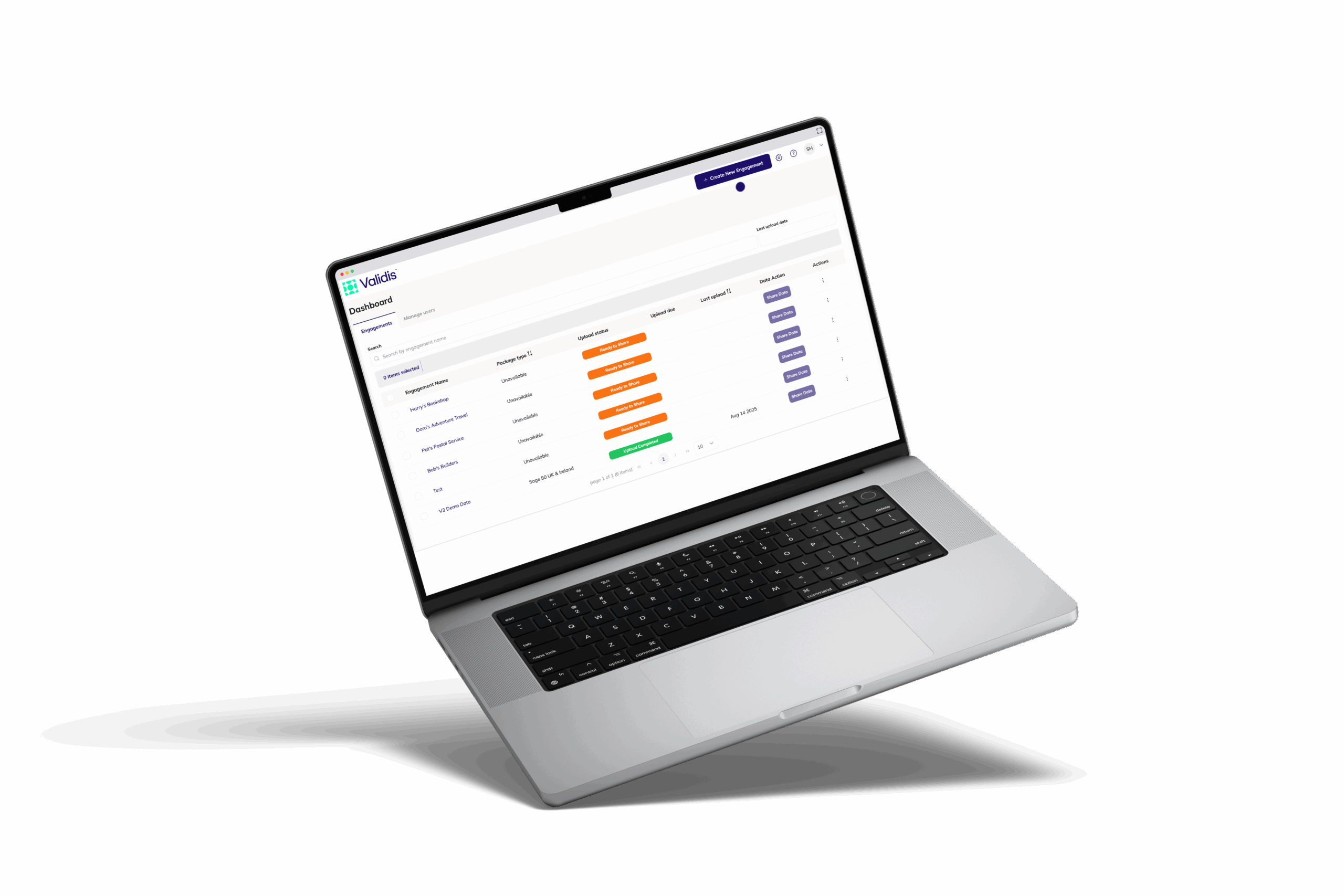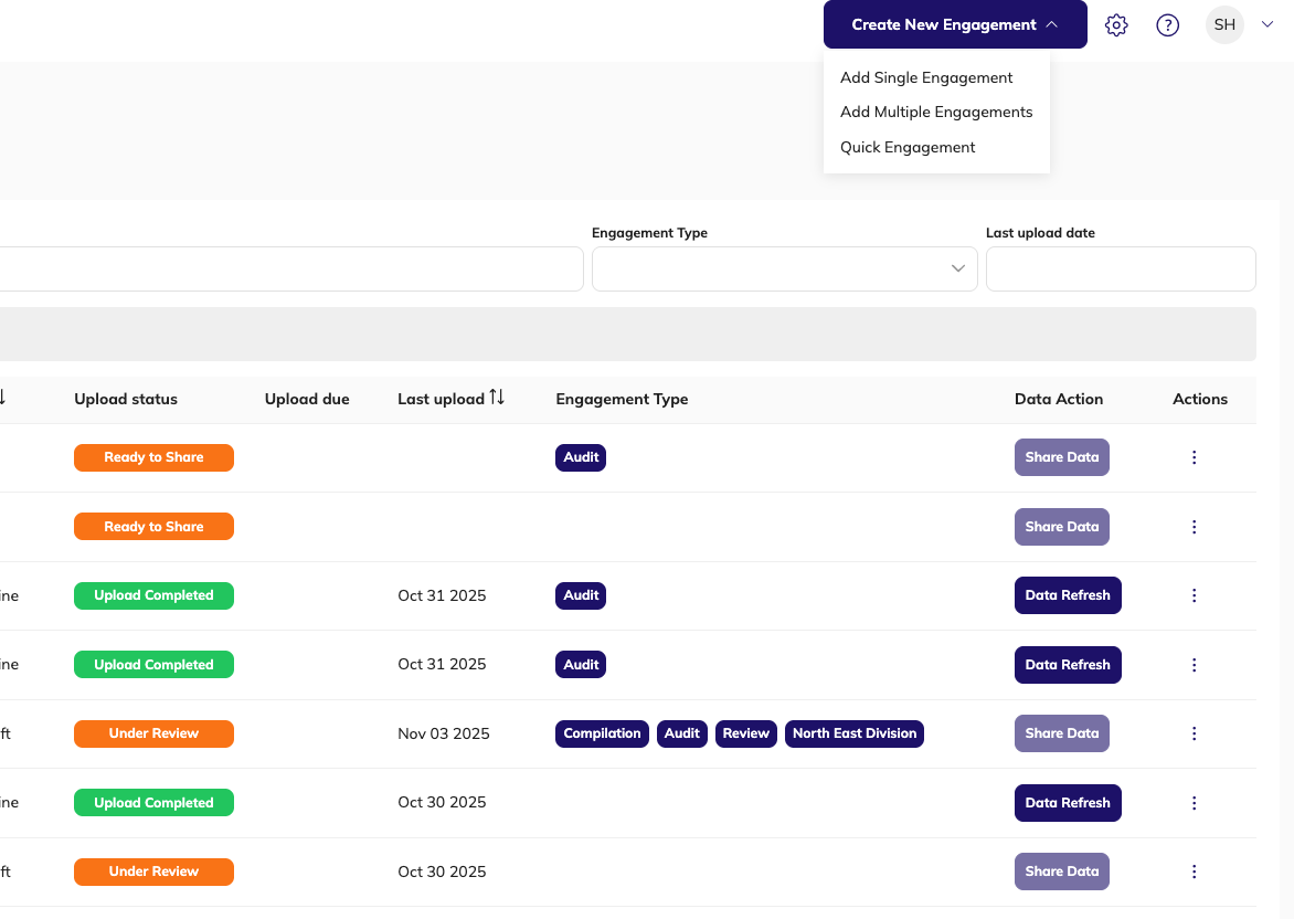 - Labels & tags – Filter by engagement type, name, accounting package, upload date, and custom tags