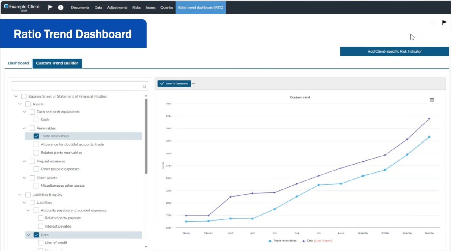 • Ratio Trend Dashboard: Compare accounts year-over-year, spot correlations, and flag anomalies worth investigating before fieldwork begins.