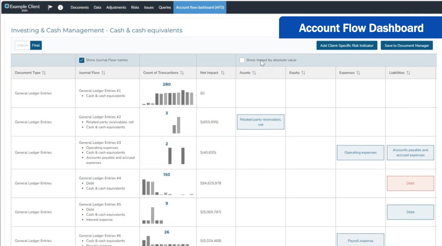 • Account Flow Dashboard: Hover to see exactly where transactions occurred, drill down to related-party activity, and target questions to specific events.