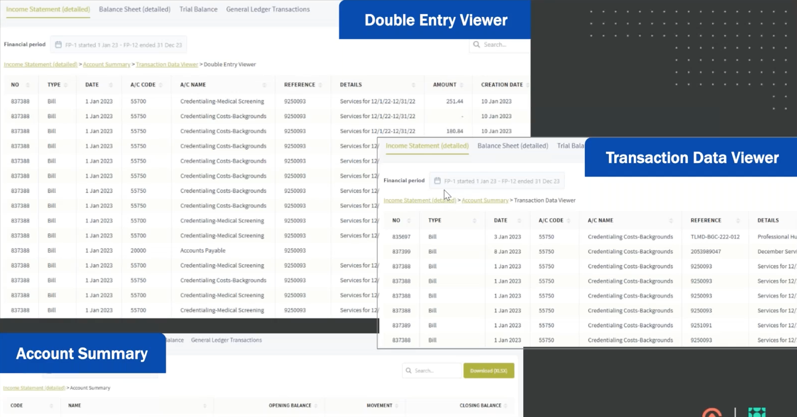 • Drill-down for clarity: Click from the income statement into a specific account, down to a specific day, and see the complete double-entry view.
